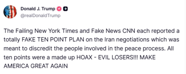 此前,川普就伊朗的“十点计划”指责主流媒体虚假报导。他在“真相社交”平台上贴文写道:“《纽约时报》和假威廉希尔体育官网CNN都报导了一份完全虚假的关于伊朗谈判的‘十点计划’,其目的是抹黑参与和平进程的人员。这‘十点计划’完全是捏造的骗局——邪恶的失败者! ! !让美国再次伟大!”