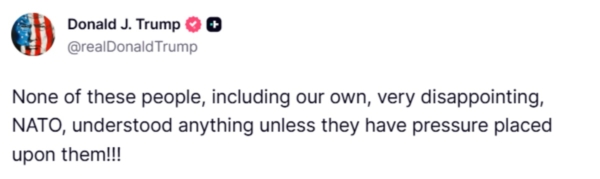 川普总统4月9日在真相社交发出最新贴文:“这些人,包括我们的自己人、非常让人失望的北约,除非受到点压力,否则什么都不懂! ! !”